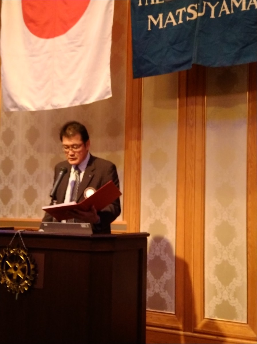 卓話は、別宮会員による「自己紹介とみずほ銀行松山支店の歩み」。